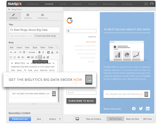 There’s no use generating traffic if you can’t convert it. Use built-in HubSpot CTAs and attach them to your blog posts, landing pages, and website and convert those dedicated readers into leads.