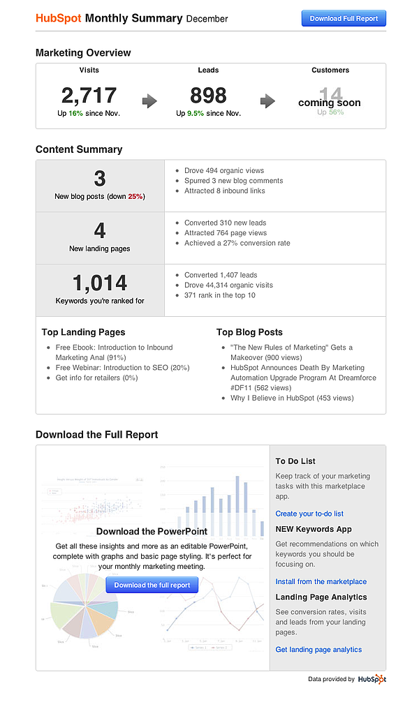 In an effort to simplify marketers' workloads, HubSpot will begin sending customers a monthly marketing summary email which outlines how their marketing faired in terms of website traffic, lead generation, and customer acquisition.