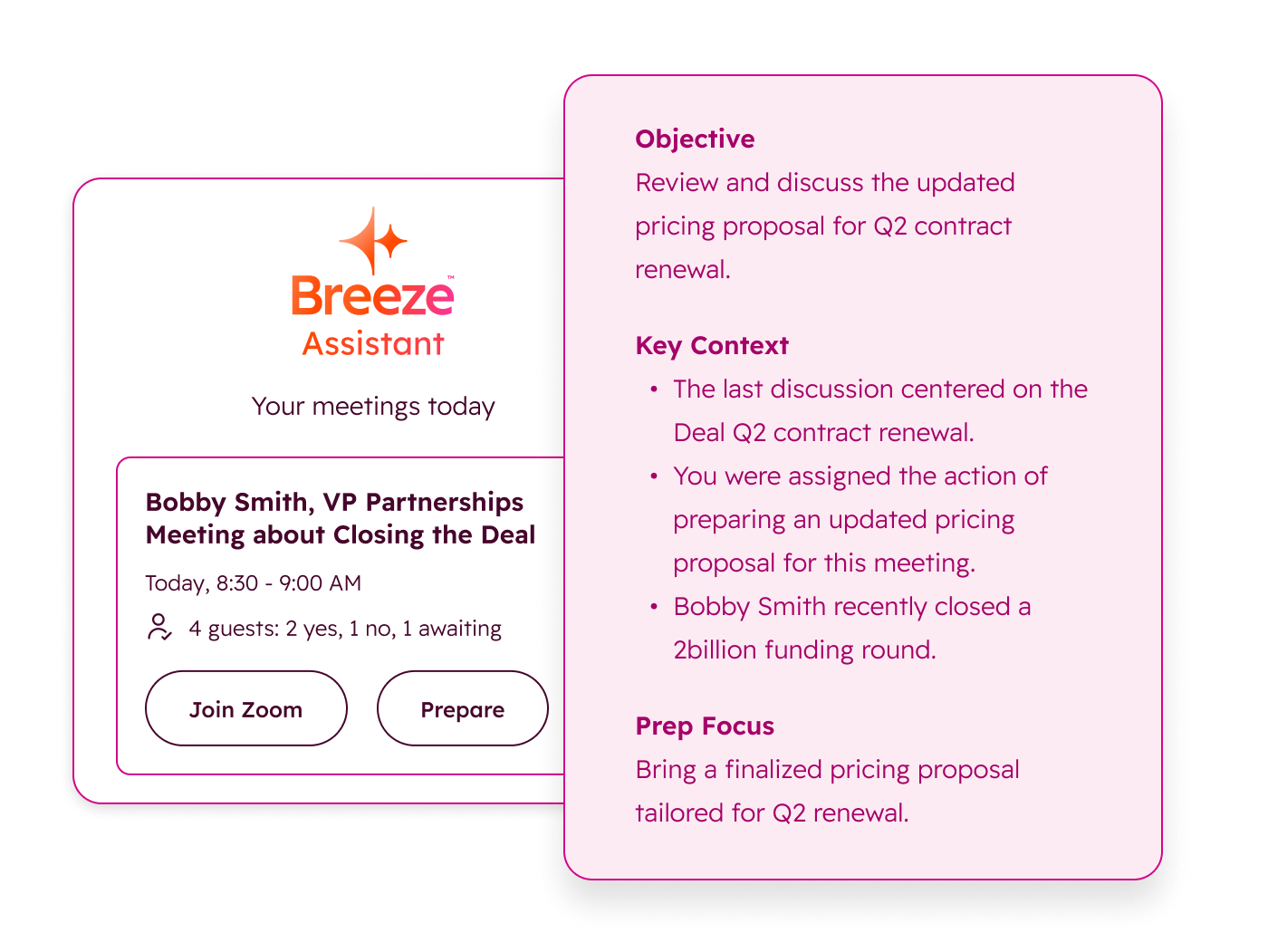 Use Breeze, HubSpot's AI, to cut the manual work slowing your team down. Breeze works across your whole customer platform — so wherever you're working, AI is already there.